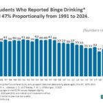 - In 2024, less than one in four college students report binge drinking (having five or more drinks in a row in the past two weeks). Despite a very slight increase (less than 1%) in the rate of binge drinking among college students (and non-college young adults), long-term declines continue with statistically significant declines noted over the past 5- and 10-year periods – down 25% proportionally and 27% proportionally, respectively.