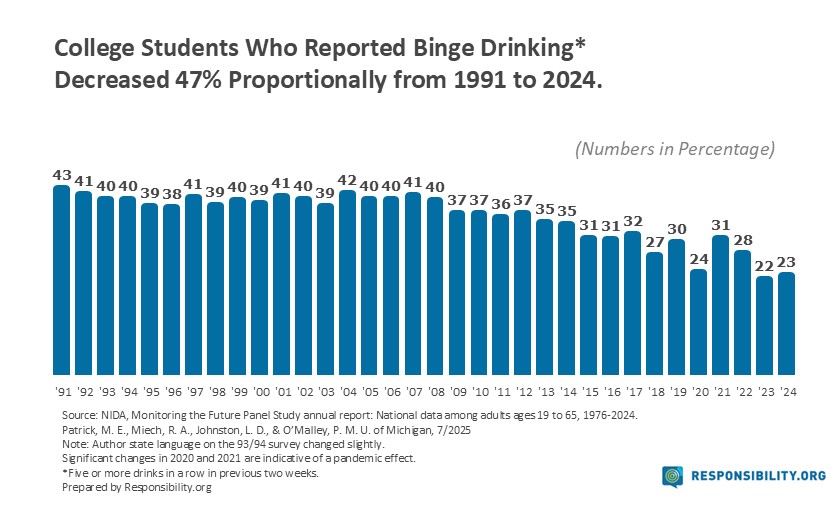 - Over the past ten years there have been significant decreases in binge drinking among college men and college women. In 2024, 25% of college men reported binge drinking and nearly 22% of college women reported engaging in this risky behavior.
