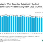 The 2024 Monitoring the Future study found the prevalence of alcohol consumption among America’s youth continued a long-term decline that has taken place over the past two decades. For the three grades combined (8th, 10th, and 12th) the proportion of students reporting lifetime, annual, current (past 30-days), and binge drinking (33 percent, 27 percent, 13 percent, and 5 percent, respectively) decreased in 2024, reaching historic low levels and below pre-pandemic rates.
