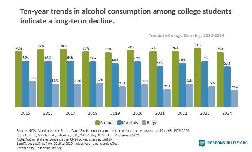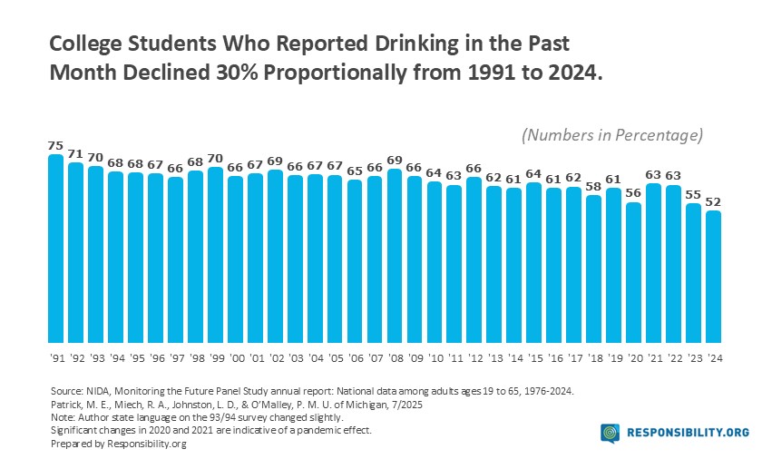 According to the 2025 Monitoring the Future Panel Study, in 2024 college students (19 to 22 years of age) reported higher prevalence rates of alcohol consumption compared to their non-college young peers. Alcohol consumption among college students has continued to decline gradually over the past decade. In 2024, past-month consumption prevalence rates reached new historic low levels (52%).