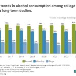 - Despite long-term downward trends in alcohol consumption among college-age adults, in 2024, college women reported higher prevalence rates for past-year consumption than college men (76% and 66%, respectively). Additionally, past month consumption among college men reached a record low (49%).