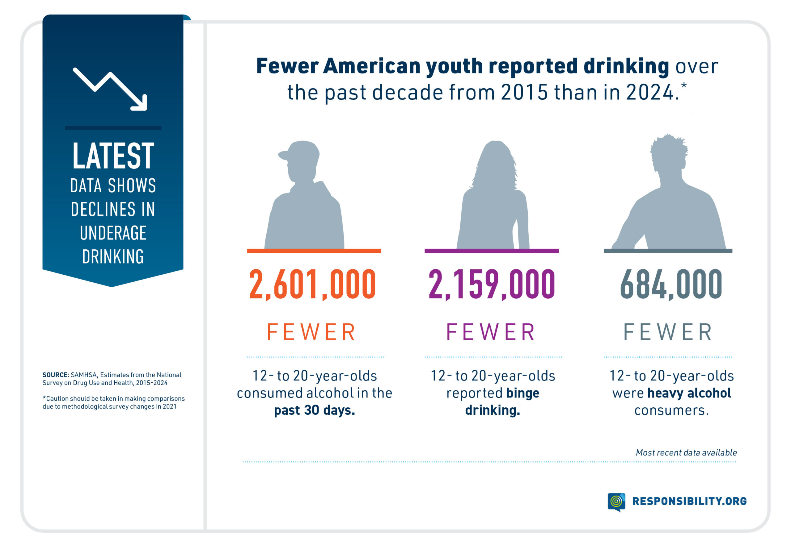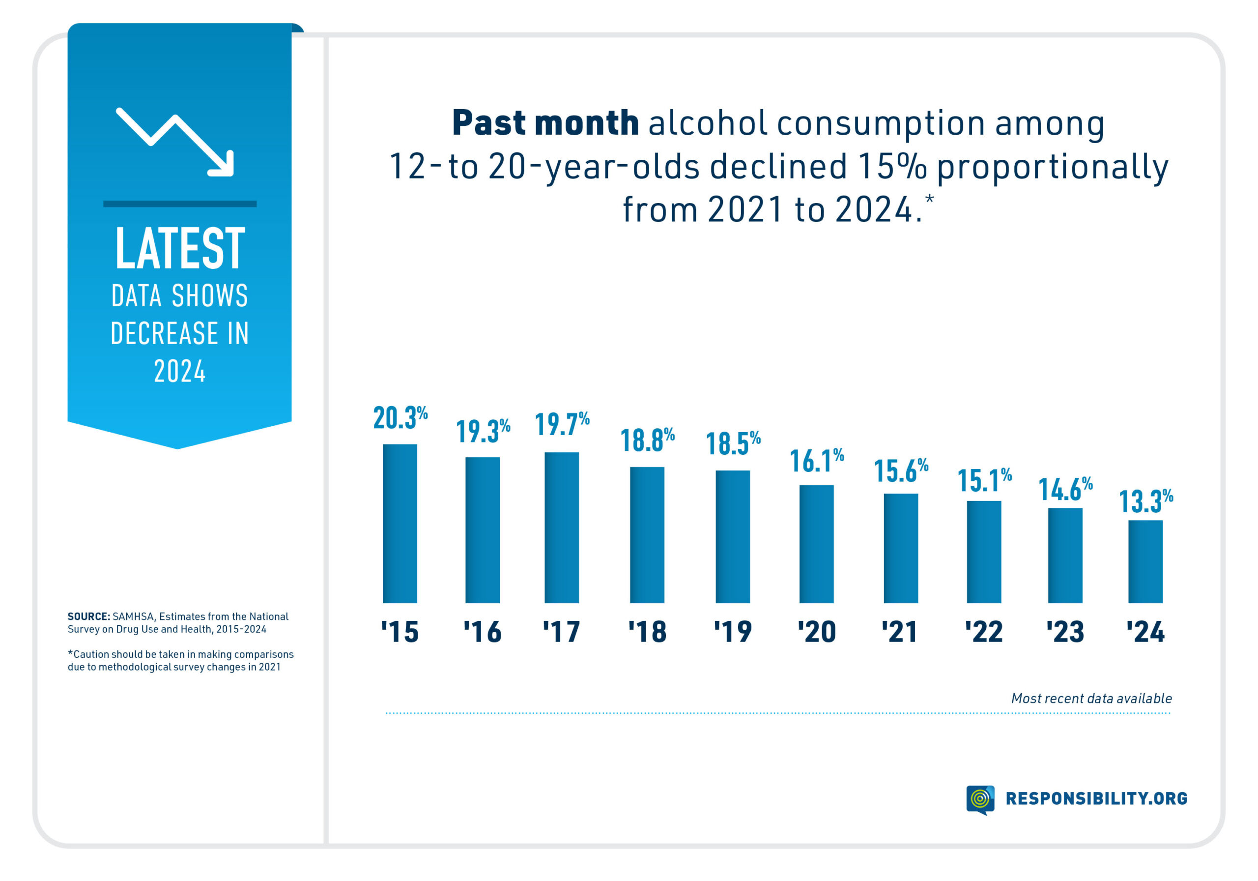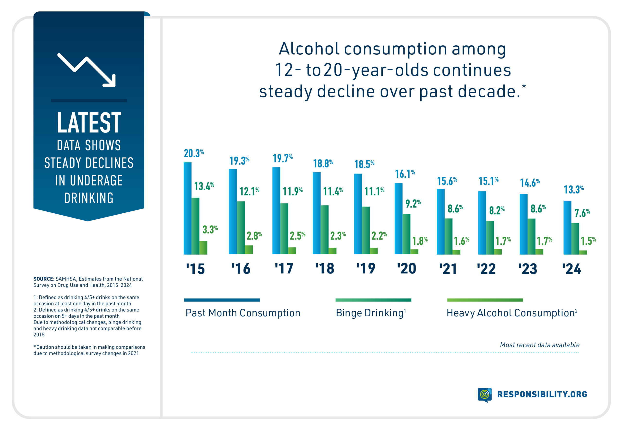 Though progress is being made, underage drinking remains a persistent problem. According to the 2024 National Survey on Drug Use and Health (NSDUH) report, about 5.1 million Americans between the ages of 12 and 20 report current alcohol consumption; this represents 13% of this age group for whom alcohol consumption is illegal. Between 2021 and 2024, the survey noted declines in the prevalence rates of alcohol consumption among 12- to 20-year-olds, including reaching historic low levels in lifetime, annual, and past month consumption. Additionally, in 2024 there were statistically significant decreases, year over year, in past month consumption, binge drinking, and heavy alcohol consumption among 12- to 20-year olds.