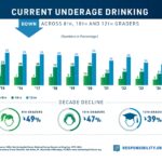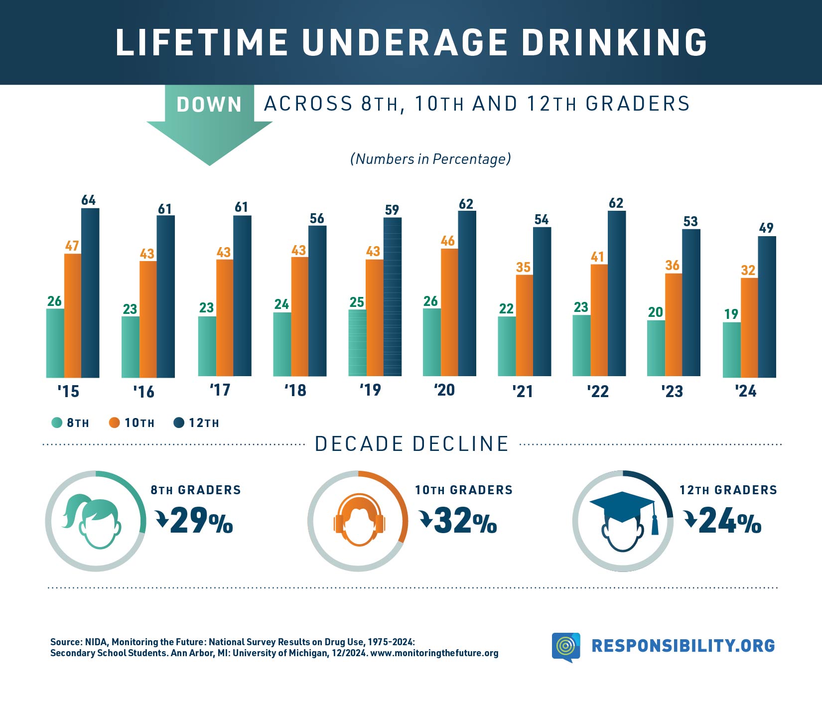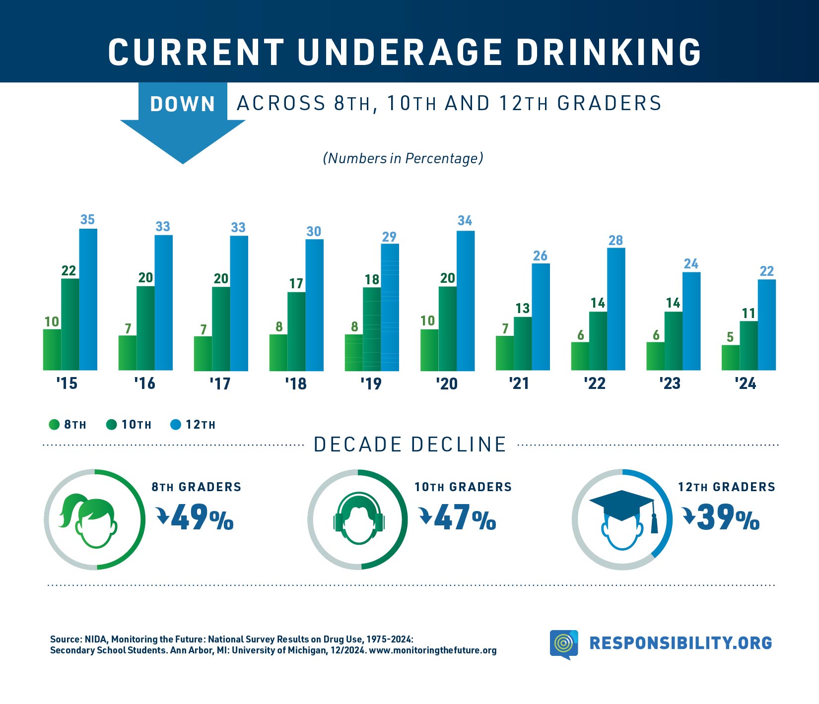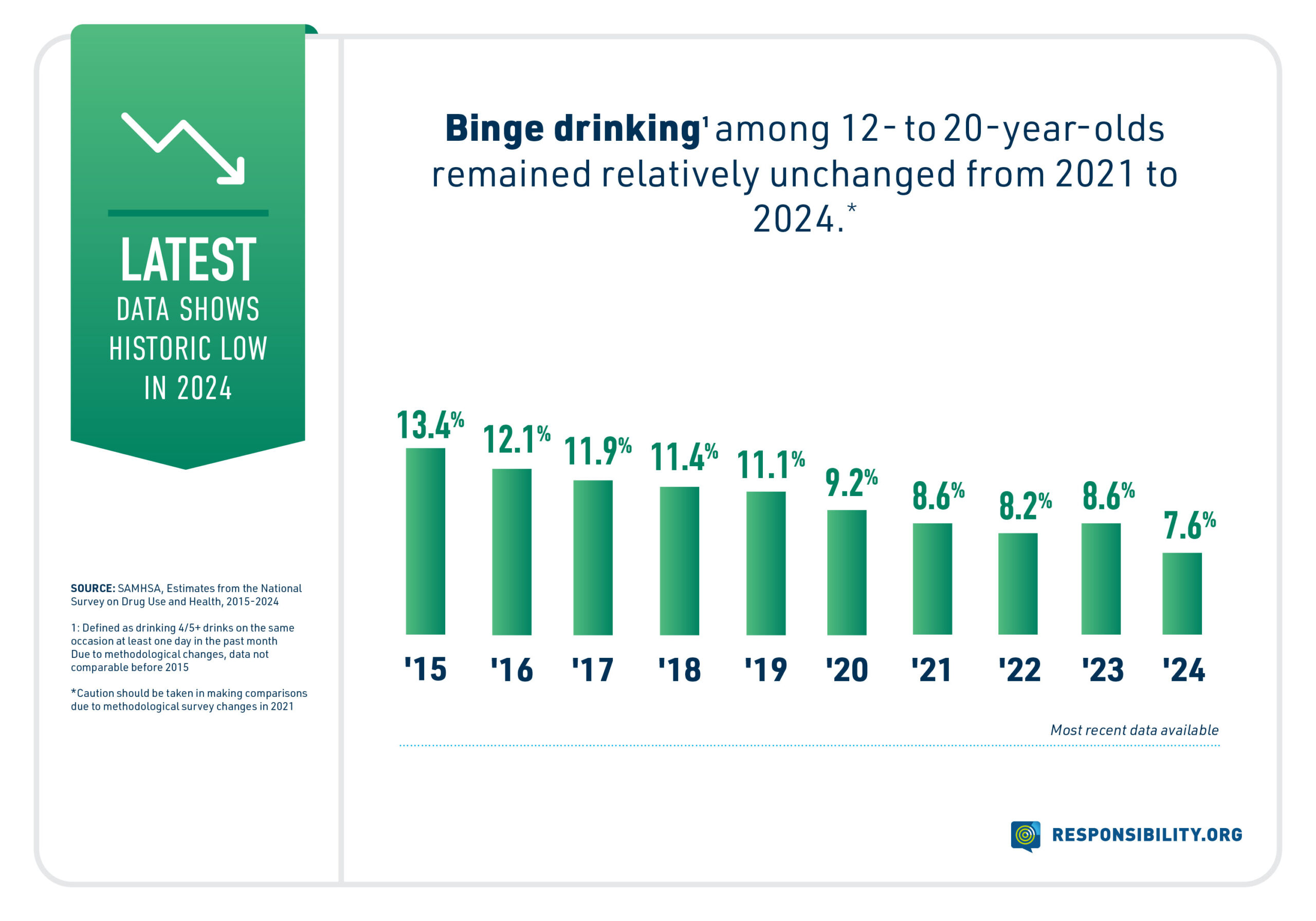 Though progress is being made, underage drinking remains a persistent problem. According to the 2024 National Survey on Drug Use and Health (NSDUH) report, about 5.1 million Americans between the ages of 12 and 20 report current alcohol consumption; this represents 13% of this age group for whom alcohol consumption is illegal. Between 2021 and 2024, the survey noted declines in the prevalence rates of alcohol consumption among 12- to 20-year-olds, including reaching historic low levels in lifetime, annual, and past month consumption. Additionally, in 2024 there were statistically significant decreases, year over year, in past month consumption, binge drinking, and heavy alcohol consumption among 12- to 20-year olds.