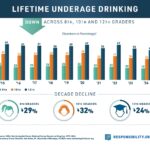 For more than three decades the Substance Abuse and Mental Health Services Administration (SAMHSA) has collected data to advance the behavioral health of Americans, reporting on key substance use and mental health indicators. From 2021 to 2024, the National Survey on Drug Use and Health surveys have shown a slight decline in the prevalence rates of lifetime, annual, and current underage drinking, while binge drinking and heavy alcohol consumption have remained relatively unchanged. Among 12- to 20-year olds, there were 2.6 million fewer underage drinkers and more than 2.1 million fewer binge drinkers since 2015.