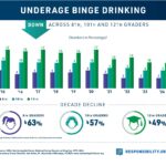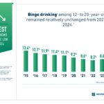 Overall substance use among teens in 2024 remained below the pre-pandemic levels reported in 2020. Underage binge drinking (defined as having five or more drinks in a row in the past two weeks) continued its long-term decline, reaching record low levels. Among 8th, 10th and 12th graders combined, binge drinking declined, with only one in 20 reporting they have engaged in this level of harmful consumption. Binge drinking declined 53 percent proportionally, from 2015 to 2024 and 75 percent since 1991.