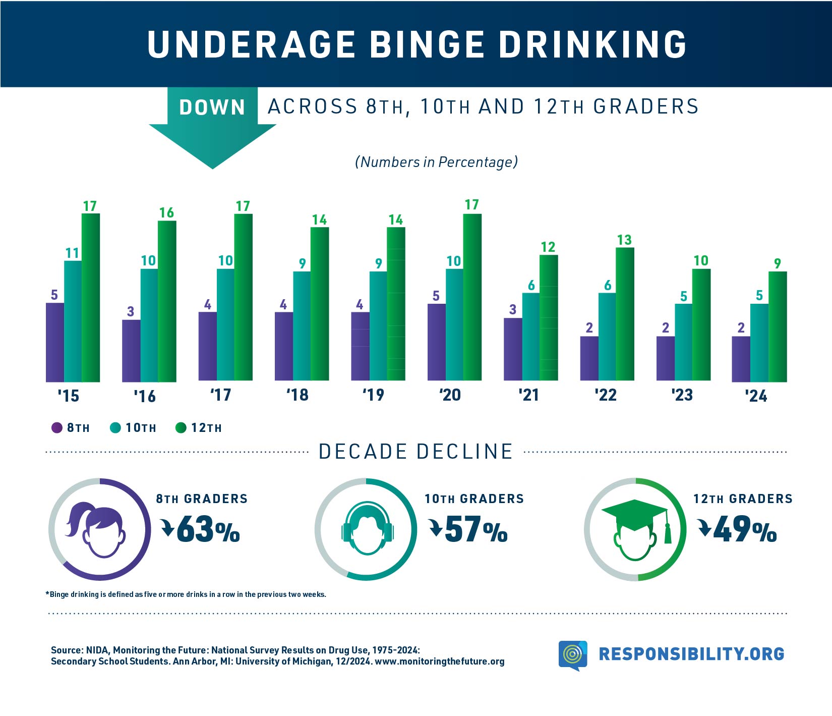 - Less than two percent of 8th graders reported binge drinking in 2024, a decrease of 84 percent from 1991, and 63 percent from 2015 to 2024.