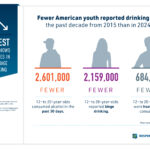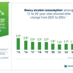 - There was no change in the rate of heavy drinking (five or more drinks on the same occasion on 5 or more days in the past 30 days) among 12- to 20-year-olds from 1.6% in 2021 to 1.5% in 2024.  (Source: SAMHSA, 2024 National Survey on Drug Use and Health, 7/2025)